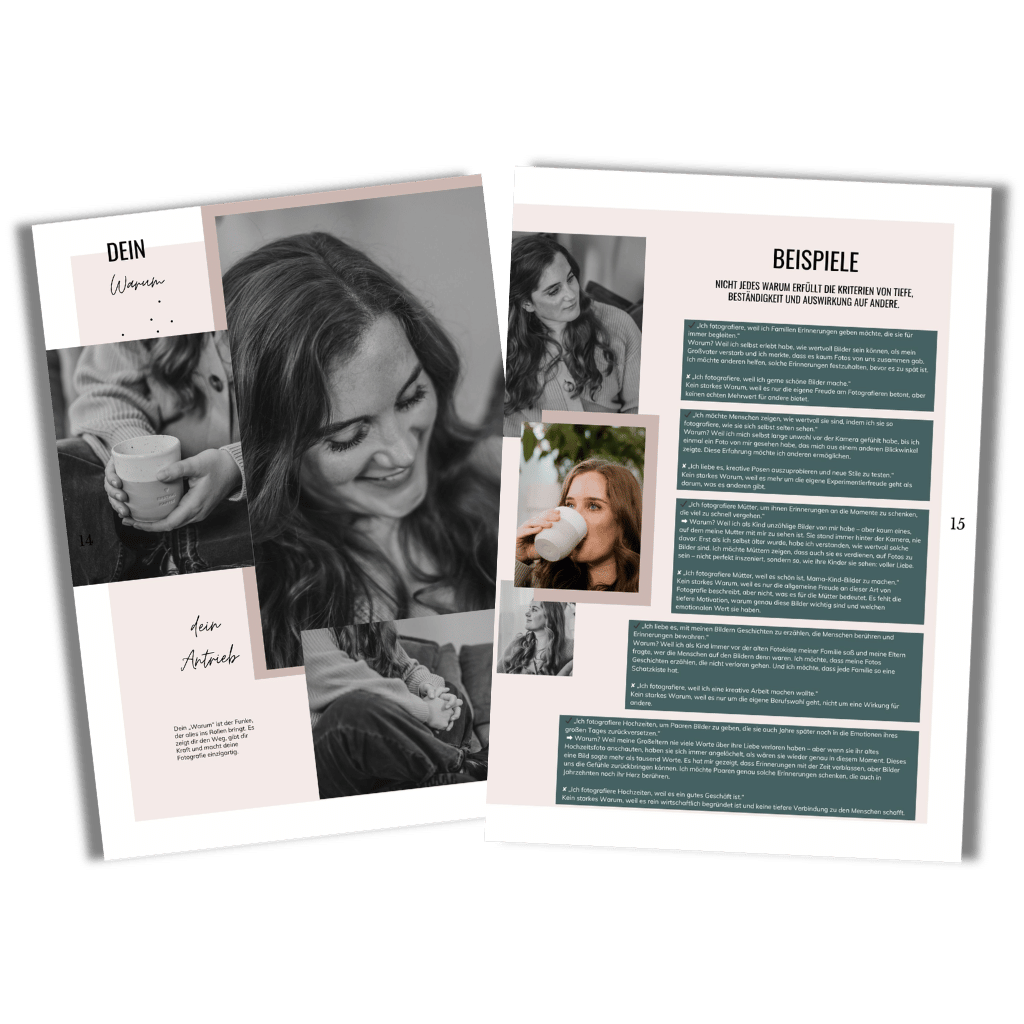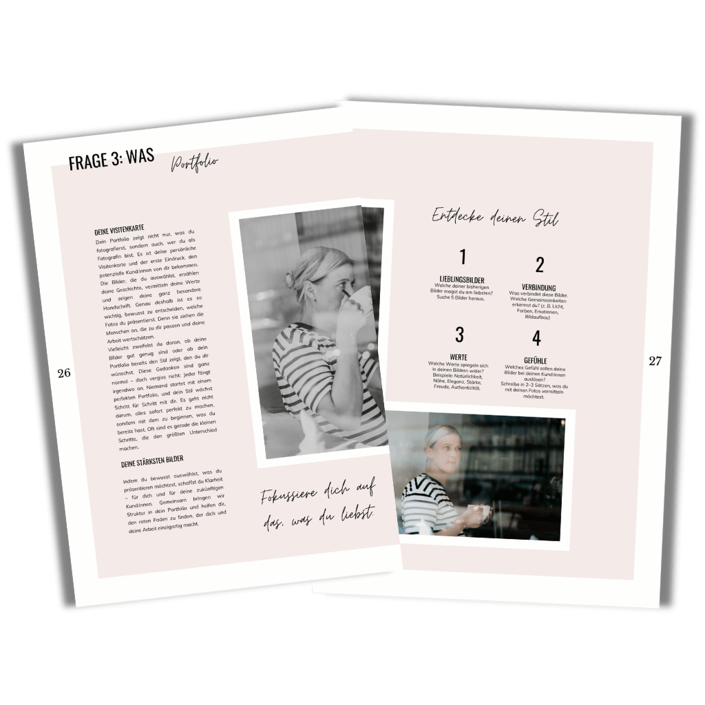 Ein gedrucktes Workbook, das dich Schritt für Schritt durch die wichtigsten Grundlagen deines Fotobusiness führt. In 5 Schritten gehst du die entscheidenden Themen durch – von deinem Warum über deine Wunschkunden bis hin zu deinen nächsten konkreten Schritten. Kein Konsum. Sondern echte Klarheit, die du dir selbst erarbeitest.