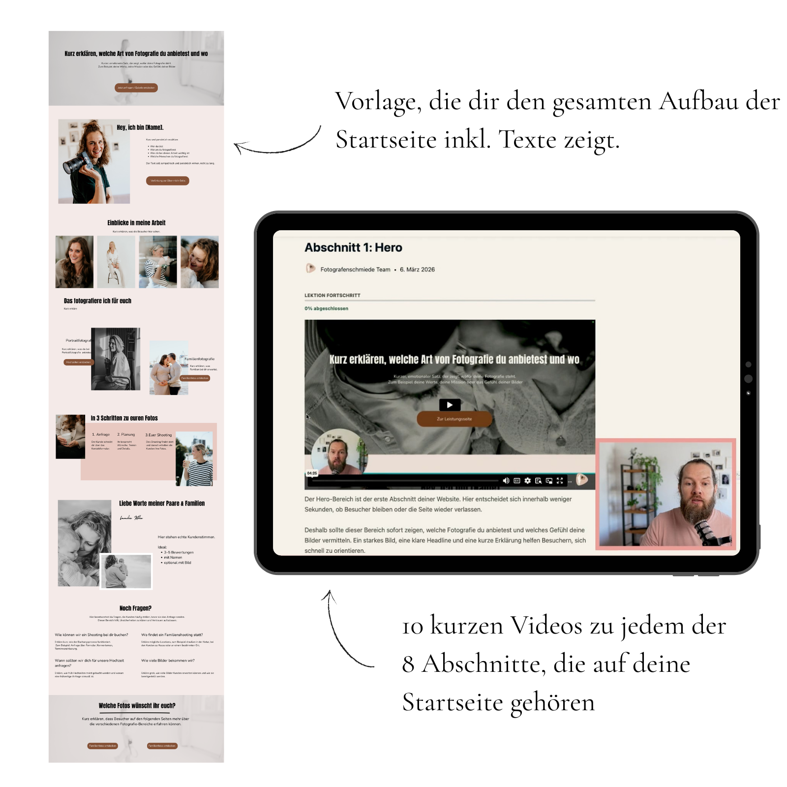 Der Startseiten Bauplan besteht aus einer Vorlage, die dir den gesamten Aufbau der Startseite inkl. Texte zeigt und 10 kurzen Videos zu jedem der 8 Abschnitte.