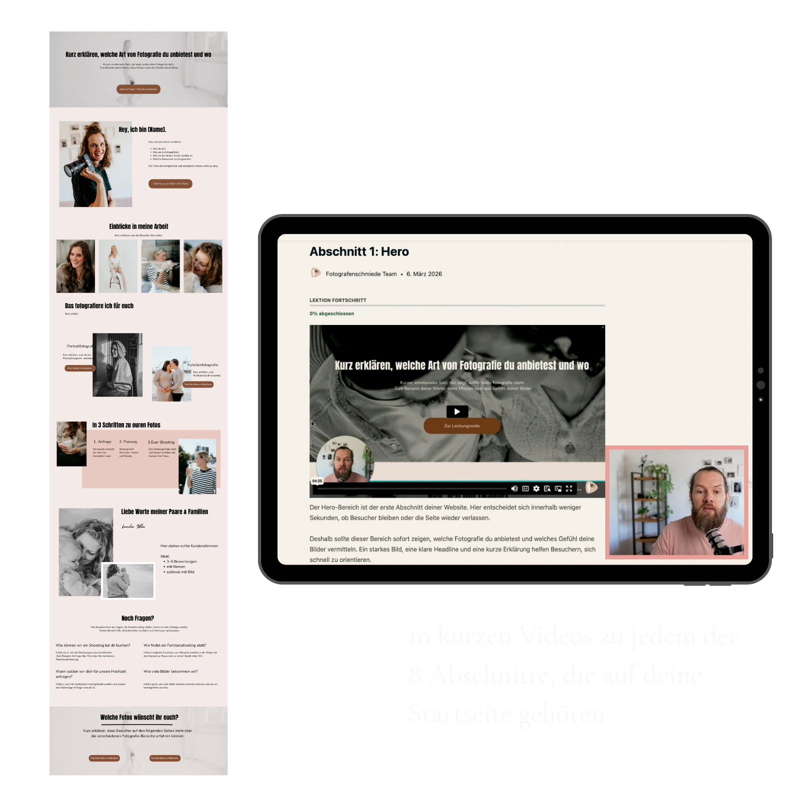 Der Startseiten Bauplan besteht aus einer Vorlage, die dir den gesamten Aufbau der Startseite inkl. Texte zeigt und 10 kurzen Videos zu jedem der 8 Abschnitte.